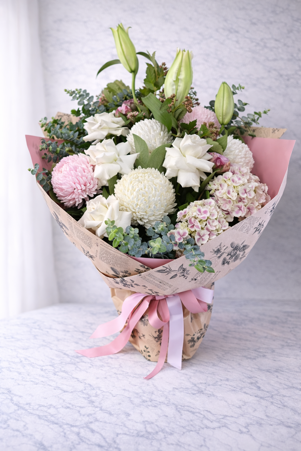 Dynamic Bouquet of fresh seasonal pretty flowers, sure to impress